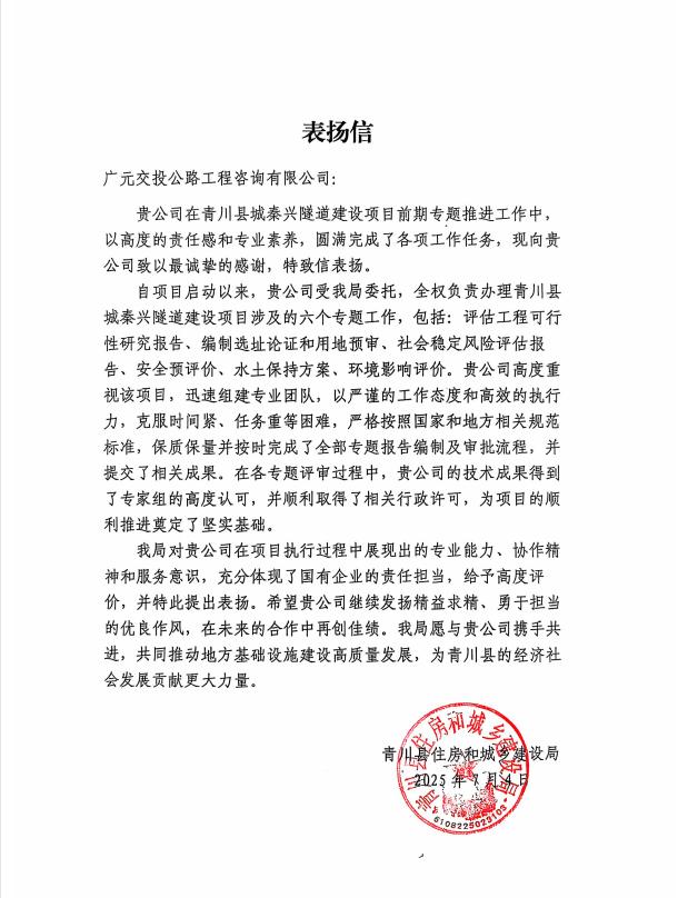 近日,广元交投公路工程咨询有限公司收到青川县住房和城乡建设局表扬信,对咨询公司在青川县城秦兴隧道建设项目前期专题推进工作中的卓越表现提出表扬。