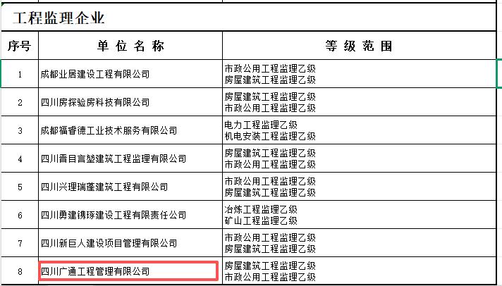 近日,四川省住房和城乡建设厅发布《关于2026年第1批建设类企业资质名单的通告》,四川广通工程管理有限公司成功通过房屋建筑、市政公用工程监理乙级资质延续核准。